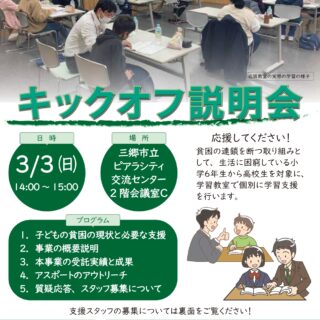 令和6年度より、新たに三郷市にて「子どもの学習・生活支援事業」を受託運営することとなりました。 つきましては本事業をサポートしてく...